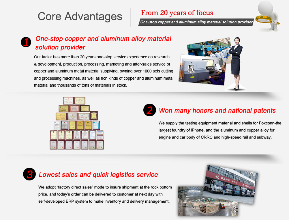 Factory history: Founded in 1998, JFCA is one of the largest domestic wholesalers of Custom and Standard Copper and Aluminum processing material. Our nearly 300,000 square feet of distribution and manufacturing space is continually stocked with over eighteen million pounds of inventory. As one national high-tech enterprise by passed ISO9001:2008,we continues to satisfy customers with all kinds of technical problem......